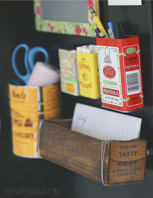 Do you want to be organized or at least to find some stuff in a kitchen where your child is running around? Turn old tins and wooden boxes into magnetic storage for the fridge.